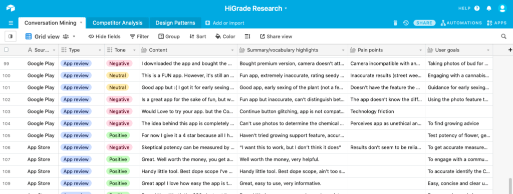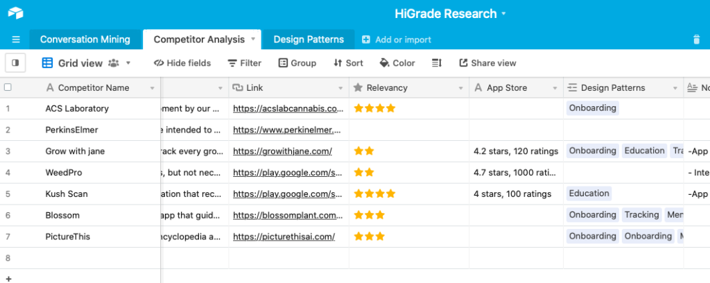 In order to understand the specific needs of HiGrade’s customers, we conducted three forms of user research: interviews, competitor analysis, and voice-of-customer feedback. Since there were multiple contributors, we needed a central location to collect our findings. Enter: Airtable.