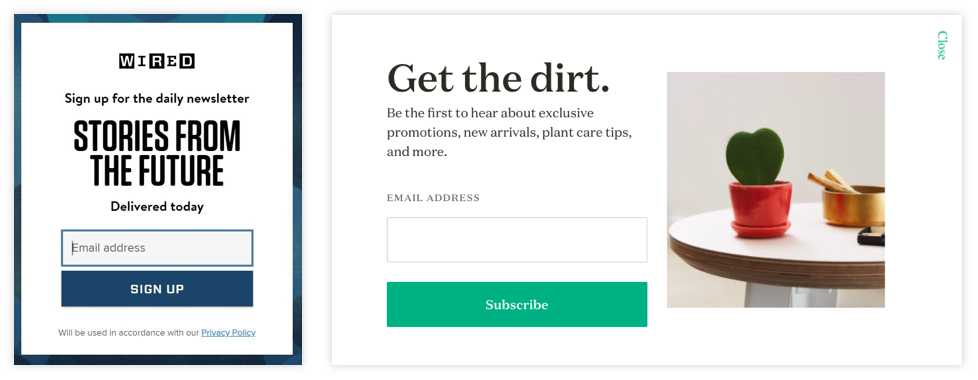 In many cases, newsletter pop-ups can be repetitive and terribly boring. In the example below, you can see that there’s a huge difference in how Wired, the tech magazine, and The Sill, an ecommerce for plants, invite us to sign up. Get the dirt or the future? It depends on your interests.