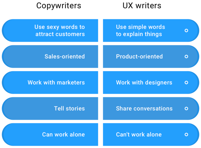 According to Monster’s definition, copywriters write slogans, scripts for advertisements, and more detailed text for print or web with the ultimate goal of creating effective and memorable advertising campaigns. Compare this to how Google defines the role of a UX Writer as one who conveys brand voice and shapes the product experience by crafting copy that helps users complete the task at hand.