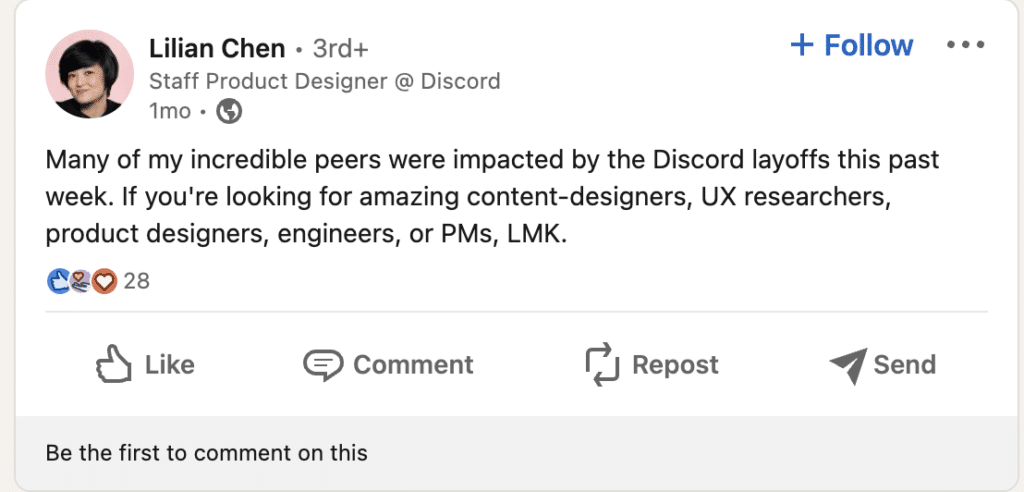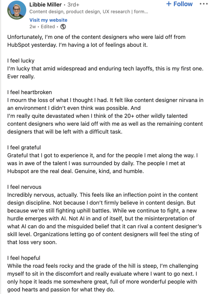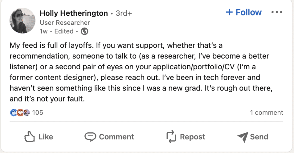 Although everyone knows that UX writing and content design layoffs are common these days, people who have been laid off still may feel a lot of shame about it. A simple LinkedIn post sharing your layoff story can help reduce these feelings, as your network is likely to respond with encouraging and sympathetic posts.