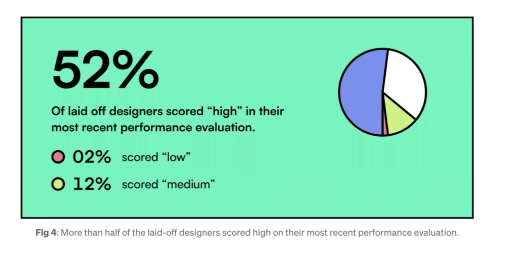 And Eva’s story is not an outlier; it’s a reflection of a larger issue at play in the tech world. In fact, Latin’s research suggests that 52% of the laid off designers in his sample were high performers, as shown in his chart below.