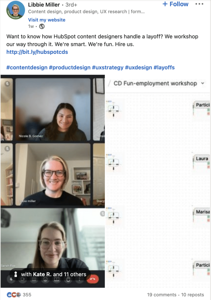If you were let go as a part of mass layoffs, make sure to stay in touch with others who were let go. These folks at HubSpot in the post strategized their way through the layoff journey together, supporting each other in the process.