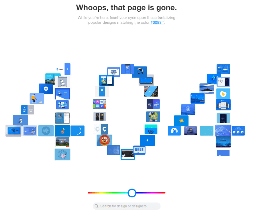 Design site Dribbble’s 404 page features a fun interactive color slider! It suits the product well, and adds a playful element.