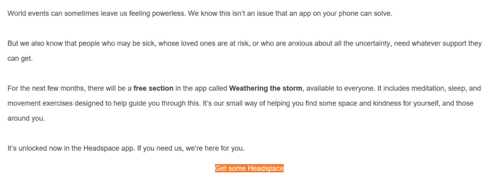 Headspace’s copy continues to impress with this perfectly pitched transactional email. Brief and to the point, it shows a lot of empathy without being pushy.