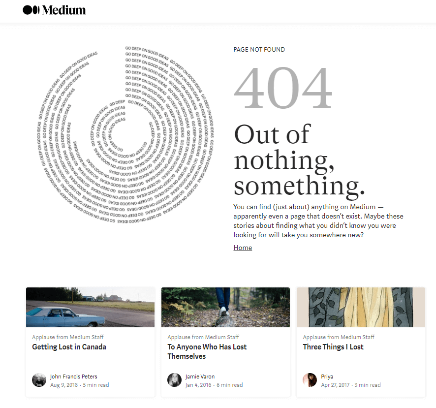 Clever example from Medium, showing stories about getting lost on the 404 screen. This highlights what the site does best – sharing all kinds of content – and hopefully makes people smile even if they haven’t found what they wanted.