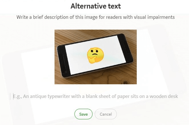 Medium helps you write proper alt texts by providing both an explanation and a full example.