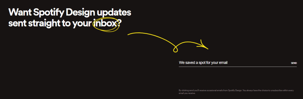 Spotify’s design team has a new way of telling people where to add their email address to sign up for a newsletter. The “saved a spot” copy is fun, and the yellow arrow makes things super clear.