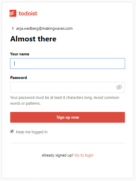 Clean, clear and completely friction-free sign-up experience from Todoist. Sometimes, there is just no need for fluff.