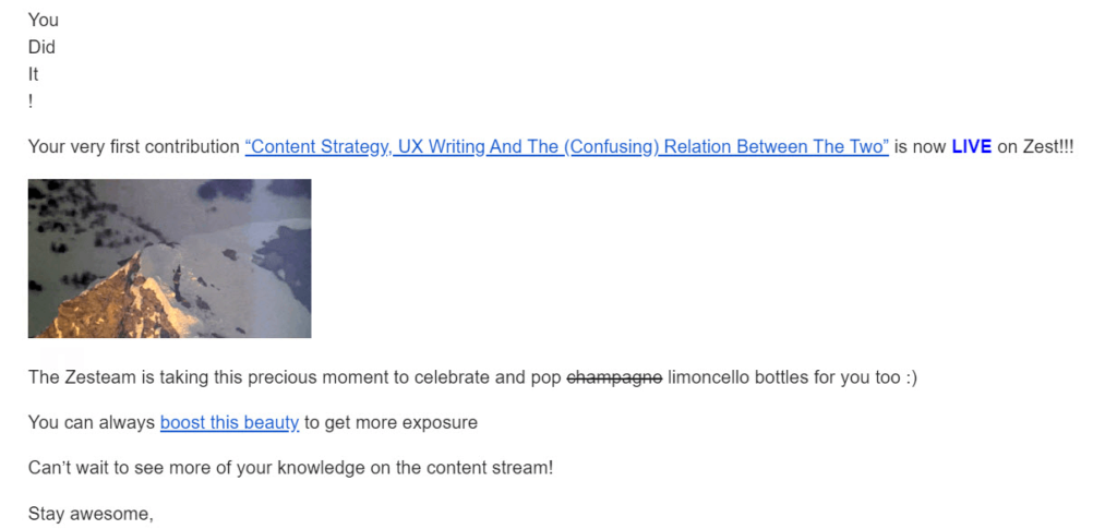 If there was a world championship in the art of writing conversational emails, Zest would surely have a shot at a medal – full points for personality.